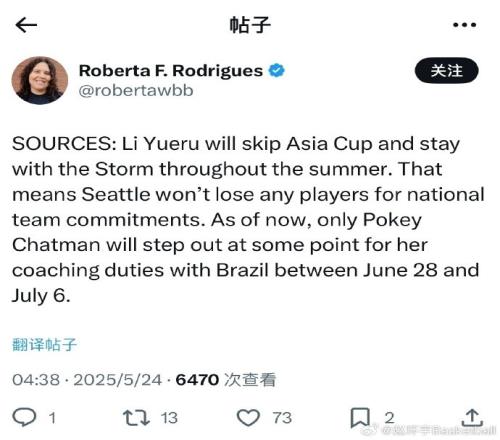 5月24日,长期跟踪报道WNBA的记者Roberta F.Rodrigues在X报道称,效力于西雅图风暴队的中国球员李月汝将不会参加2025女篮亚洲杯,“整个夏天她都会与风暴队在一起。”而该队副总经理兼助理教练Pokey Chatman则会离队,去女篮美洲杯履行巴西女篮主教练的职责。
